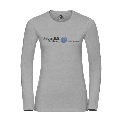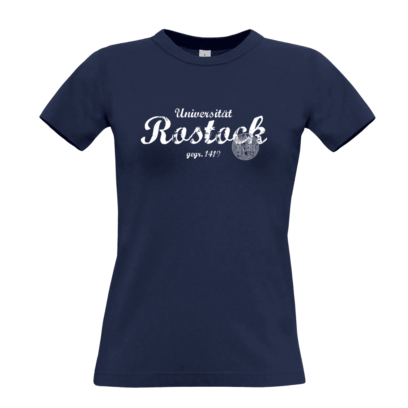 Damen T-Shirt mit original Schriftzug der Uni Rostock und blauem Siegel
